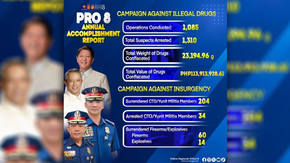 Ayon sa Police Regional Office 8 (PRO-8), nagsagawa sila ng 1,085 Anti-Illegal Drug Operations noong nakaraang taon, na nagresulta sa pagkakasamsam ng 23.19 kilos ng illegal drugs.