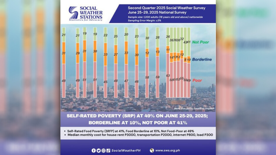 HALOS kalahati o 49 percent ng mga pamilyang Pilipino o tinatayang 13.7 million families ang ikinu-konsidera ang kanilang sarili na mahirap, sa ikalawang quarter ng taon, ayon sa pinakahuling survey ng Social Weather Stations (SWS).