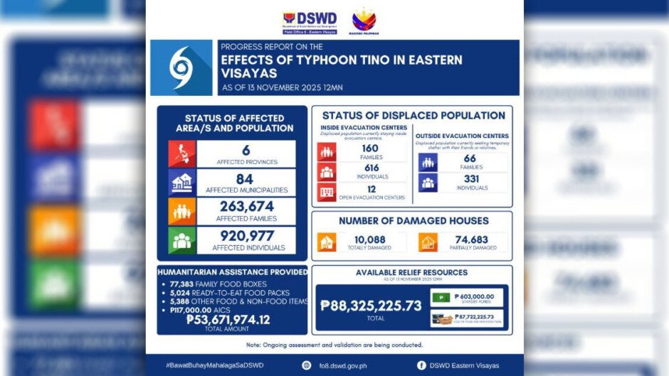 Aabot sa 263,674 families mula sa 84 Local Government Units sa mga lalawigan ng Southern Leyte, Leyte, Samar, Northern Samar, Eastern Samar, at Biliran ang naapektuhan ng Bagyong Tino nang dumaan ito sa rehiyon noong Nov. 3.