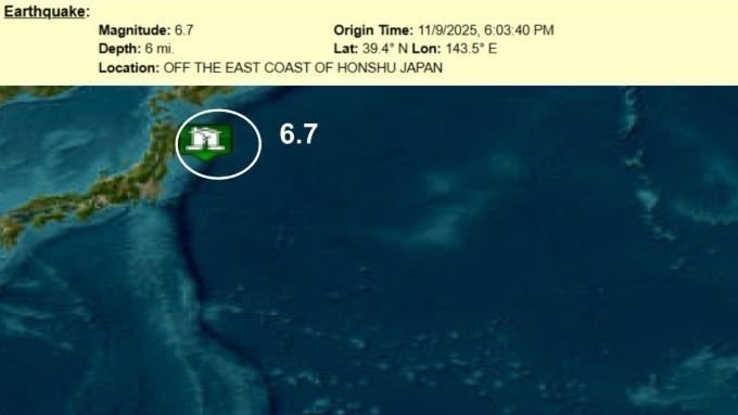 NIYANIG ng Magnitude 6.7 na lindol ang East Coast ng Honshu, Japan pasado alas sais ng hapon ngayong Linggo, November 9.