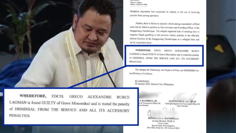 SINIBAK ng Office of the Ombudsman si Albay Governor Edcel Greco “Grex” Lagman sa pwesto nito bunsod ng Grave Misconduct kaugnay ng pagtanggap ng payola mula sa jueteng.