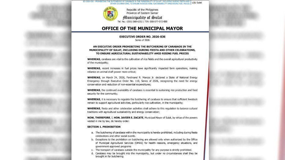 Sinabi ni Sulat Mayor Javier Zacate na naglabas siya ng Executive Order (EO) na nagbabawal sa pagkatay ng kalabaw, kahit na sa mga pista at iba pang mga okasyon, upang matiyak ang agricultural sustainability.