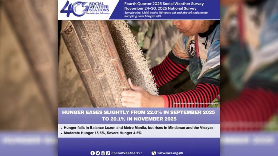 Sa 2025 4th quarter survey ng SWS na ginawa mula November 24 hanggang 30, mayroong 20.1 percent ng pamilyang Pinoy ang nagsabing nakaranas sila ng Involuntary Hunger noong Nobyembre.