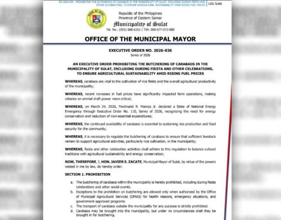IPINAGBAWAL ng Municipal Government ng Sulat sa Eastern Samar ang pagkatay sa mga kalabaw sa pangambang.