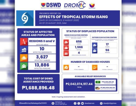 AABOT sa 3,627 families ang naapektuhan ng Tropical Storm Isang, na lumabas ng Philippine Area of.