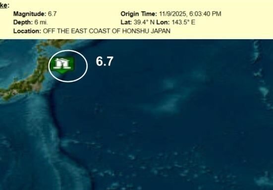 NIYANIG ng Magnitude 6.7 na lindol ang East Coast ng Honshu, Japan pasado alas sais ng.