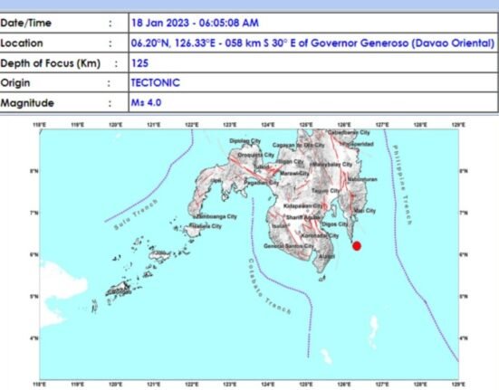 TUMAMA ang magnitude 4.0 na lindol sa lalawigan ng Davao Oriental. Naitala ng Phivolcs ang epicenter.