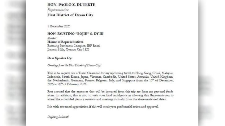 HINILING ni Davao City Rep. Paolo “Pulong” Duterte kay Speaker at Isabela Rep. Faustino “Bojie” Dy III na maka-biyahe simula Dec. 16 hanggang Feb. 20, 2026.