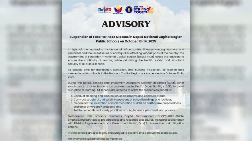 Sa Advisory, tinukoy ng DepEd-NCR ang tumataas na bilang ng Influenza-like Illnesses sa mga estudyante at personnel, pati na ang sunod-sunod na lindol na tumama sa iba’t ibang bahagi ng bansa.