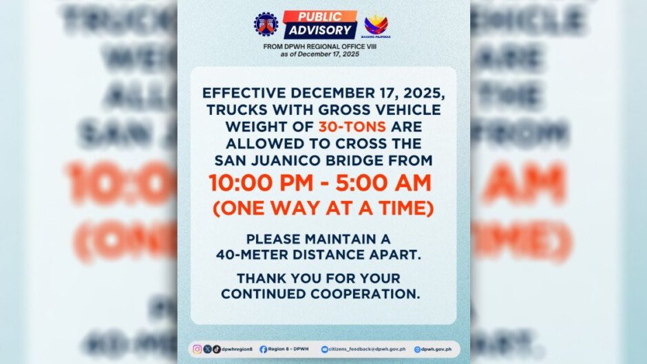 Sa public advisory, sinabi ng ahensya na maari ng dumaan ang 30-ton trucks at iba pang mabibigat na sasakyan na tumawid sa tulay, simula alas diyes ng gabi hanggang ala singko ng umaga.