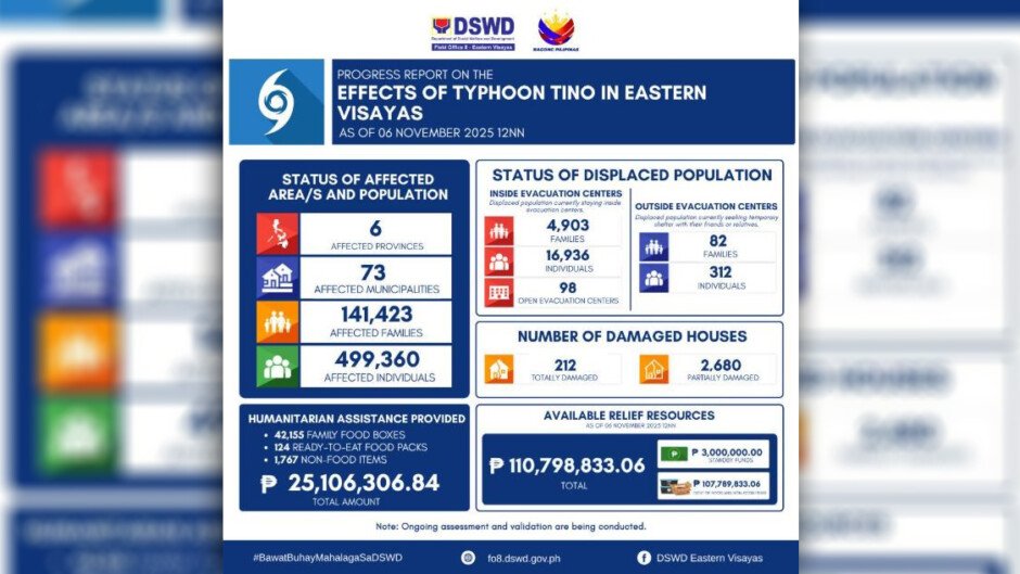 Aabot sa 141,423 families o 499,360 individuals ang naapektuhan ng Bagyong Tino nang manalasa ito sa Eastern Visayas noong Nov. 4.