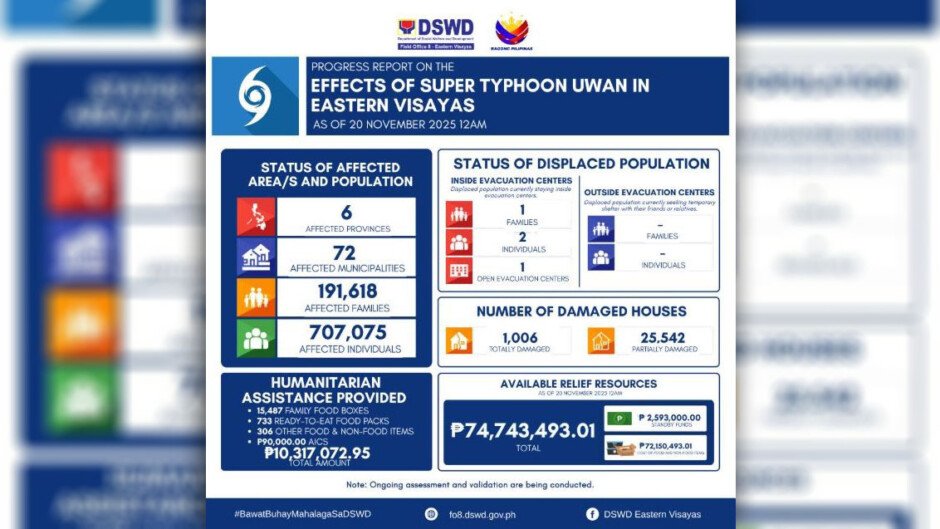NAMAHAGI ang Department of Social Welfare and Development (DSWD) ng 10.31 million pesos na halaga ng humanitarian assistance sa mga pamilyang naapektuhan ng Super Typhoon Uwan sa Eastern Visayas.
