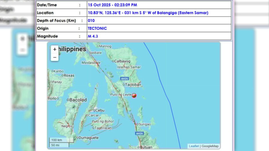 Naitala ng Phivolcs ang epicenter ng pagyanig sa layong 31 kilometers Southwest ng Balangiga, 2:23 ng hapon ngayong Miyerkules, Oct. 15.