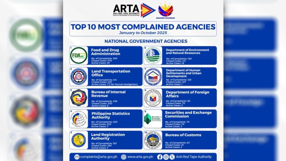 Batay ito sa pinakabagong datos mula sa Anti-Red Tape Authority (ARTA), mula January to October 2025.