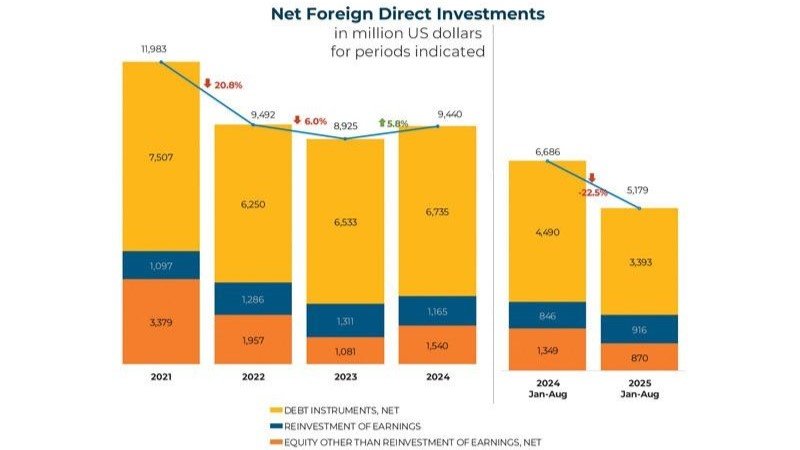 Sa datos mula sa Bangko Sentral ng Pilipinas (BSP), 494 million dollars ang FDI Net Inflows noong ika-walong buwan, mas mababa ng 40.5 percent mula sa 830 million dollars na naitala noong August 2024.