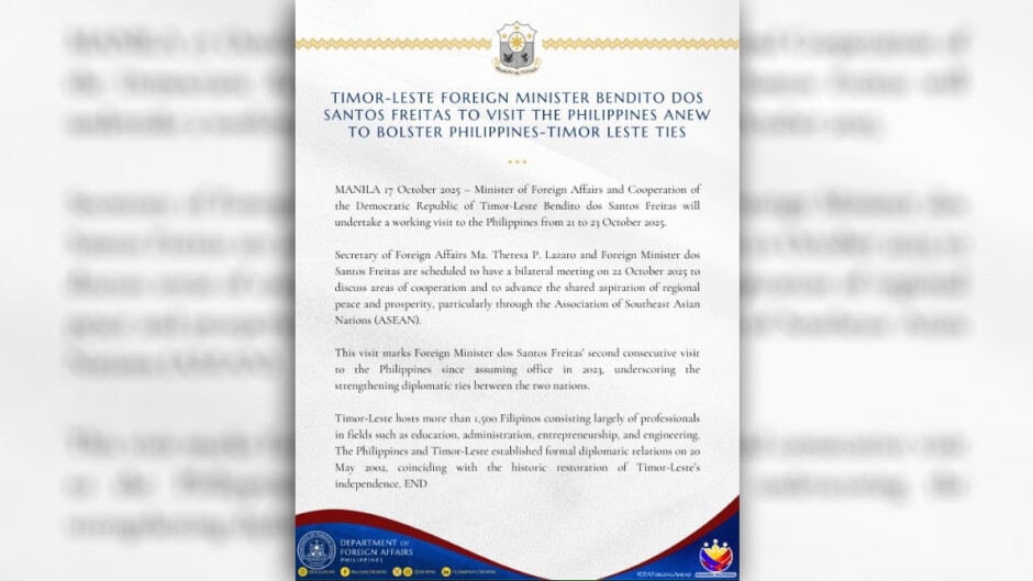 INANUNSYO ng Department of Foreign Affairs (DFA) ang nakatakdang Working Visit ni Timor-Leste Foreign Minister Benito Dos Santos Freitas sa Pilipinas, simula bukas, sa Oct. 21 hanggang 23.