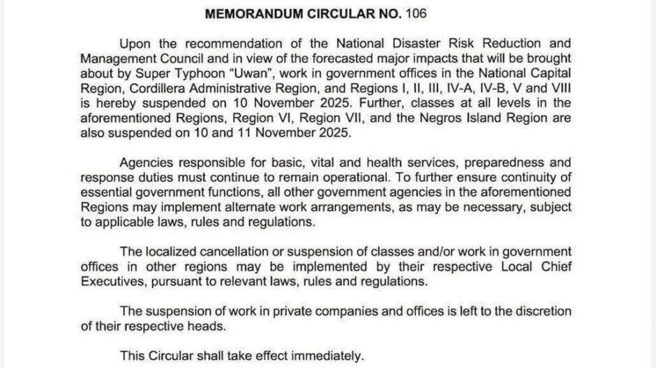 Sa Memorandum Circular na nilagdaaan ni Executive Secretary Lucas Bersamin, suspendido ang trabaho sa gobyerno ngayong araw, November 10 sa NCR, CAR at Regions 1, 2, 3, 4-A, 4-B, V, at 8.
