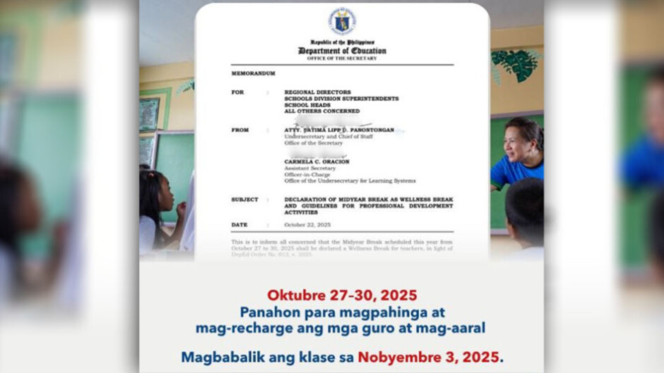 Ayon kay DepEd Secretary Sonny Angara, sa pagkakaroon ng Wellness Break mabibigyan ng tyansa ang mga guro at mag-aaral na makapagpahinga at maka-recover sa mga nagdaang kalamidad at sa nararanasan ding pagtaas ng kaso ng Flu-like Illnesses.