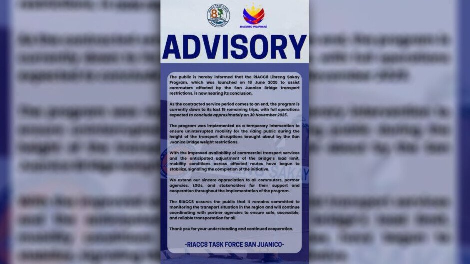 MATAPOS ang mahigit anim na buwan, inanunsyo ng Regional Inter-Agency Coordination Committee (RIACC) sa Eastern Visayas na huling Linggo na ng kanilang “Libreng Sakay” Program, dahil sa patuloy na pagbuti ng transport conditions sa San Juanico Bridge.