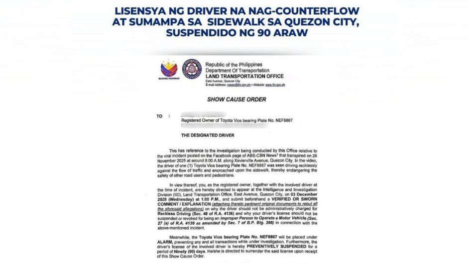 Ipinatatawag na ng Land Transportation Office ang driver at ang rehistradong owner ng Toyota Vios para humarap sa pagdinig na itinakda sa December 3.
