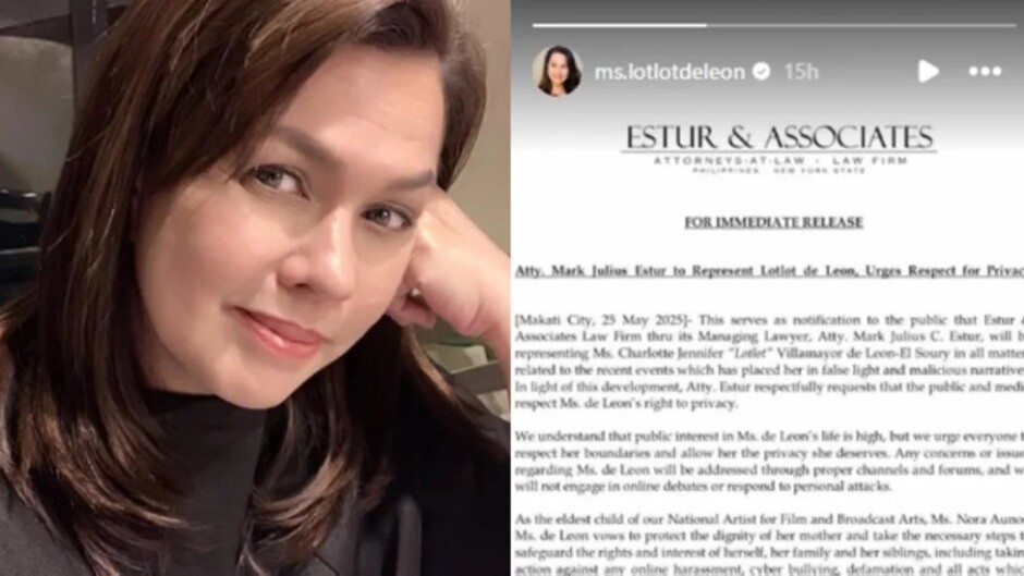 KUMUHA ng abogado si Lotlot De Leon upang ipagtanggol ang kanyang Right to Privacy at protektahan ang dignidad ng kanyang yumaong ina na si Nora Aunor, laban sa mga naninira sa reputasyon ng kanilang pamilya.