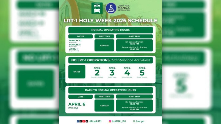 Sa abiso ng Light Rail Manila Corporation o LRMC, walang operasyon ang LRT-1 mula April 2 hanggang April 5.