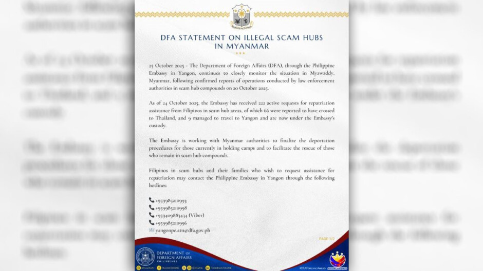 Sa Datos ng Philippine Embassy sa Yangon, umabot na sa 222 ang natanggap nitong Active Requests para sa Repatriation Assistance mula sa mga Pinoy sa Scam Hub Areas sa Myanmar.