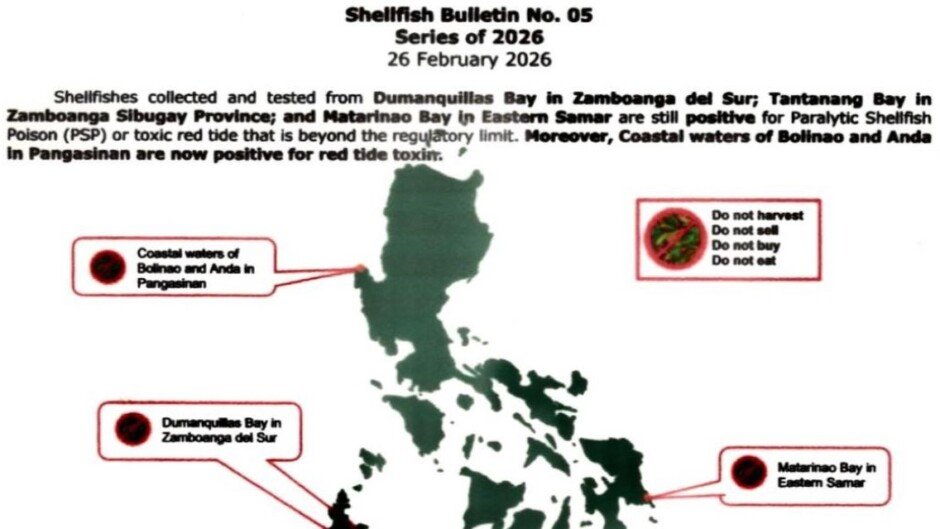 Ayon sa Bureau of Fisheries and Aquatic Resources, ang Paralytic Shellfish Poison mula sa mga shellfish na nakuha sa nabanggit na mga baybayin ay lagpas sa regulatory limit.