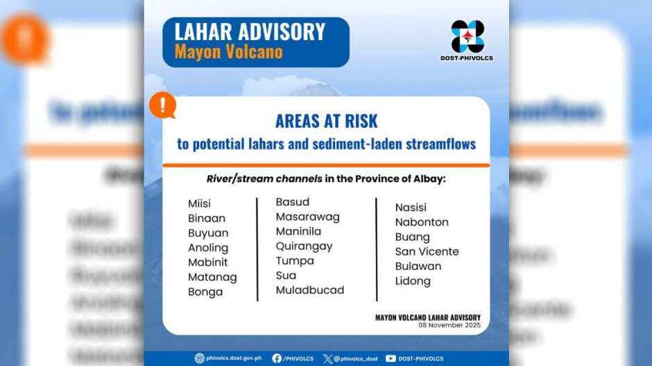 Ayon sa PHIVOLCS, dahil sa Super Bagyong Uwan may banta ng Lahar at Sediment-Laden Streamflows mula sa Mayon Volcano.