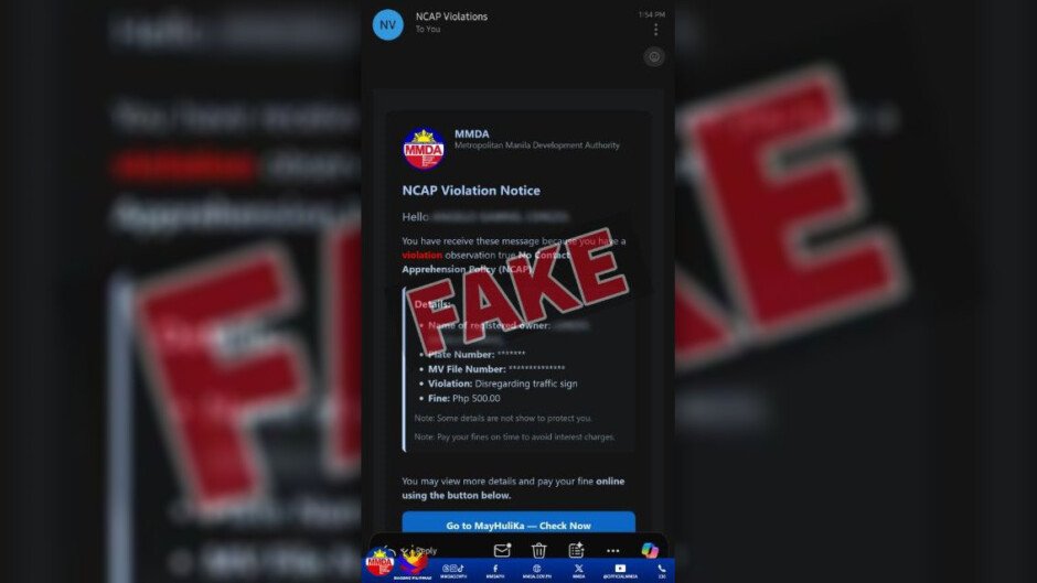 Sa natanggap na impormasyon ng ahensya, ipinadadala ang mensahe sa email at na naglalaman ito ng umano’y traffic violation sa ilalim ng No Contact Apprehension Policy o NCAP kasama ang proseso kung paano babayaran ang paglabag sa pamamagitan ng pag-click sa button.