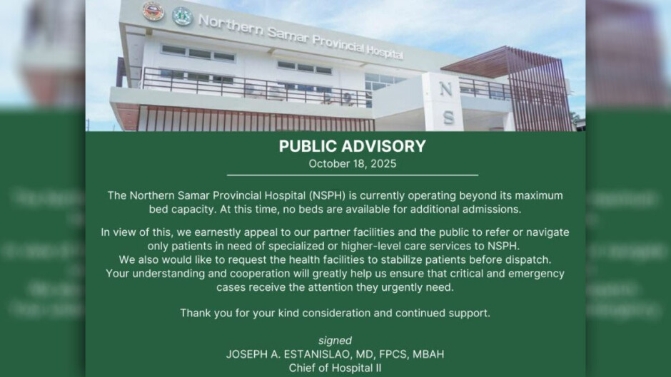 UMAPELA ng pang-unawa at kooperasyon sa publiko ang Northern Samar Provincial Hospital (NSPH), sa harap ng patuloy na pagtaas ng bilang ng mga ina-admit na ahensya at ngayon ay nag-o-operate ng mahigit sa doble ng kanilang Authorized Capacity.