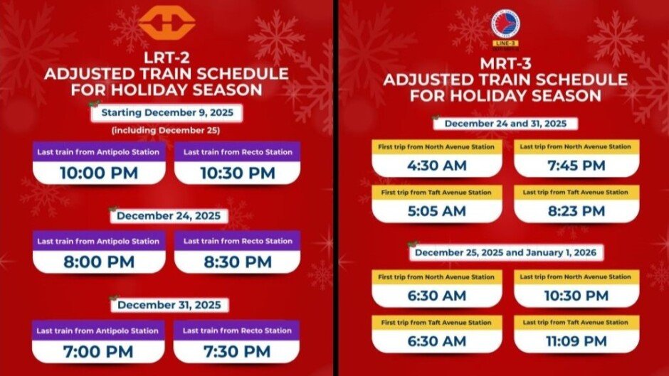 Samantala, ang MRT naman ay magpapatupad ng reduced train schedule sa December 24 at 31 at adjusted schedule para sa December 25 at January 1.