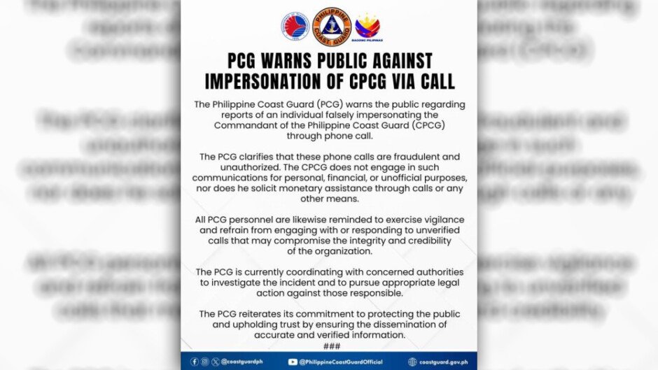 Ayon sa PCG, may mga scammer na nanloloko sa pamamagitan ng tawag sa telepono at ginagamit si Admiral Ronnie Gavan para manghingi ng pera o donasyon.