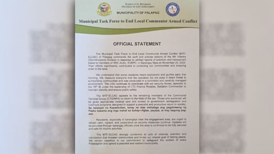 Ginawa ng Municipal Task Force to End Local Communist Armed Conflict (MTF-ELCAC) ang pahayag matapos maka-engkwentro ng 78th Infantry Battalion ang mga miyembro ng NPA sa kanilang hideouts na may mga nakatagong Anti-Personnel Mines.