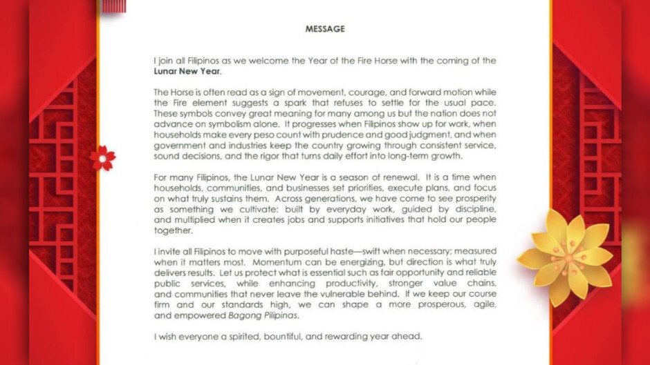 Sa kanyang mensahe sa pagsalubong sa Year of the Fire Horse, sinabi ng pangulo na sinisimbolo ng kabayo ang pagkilos, katapangan at pagsulong habang ang apoy ay para sa energy at drive.