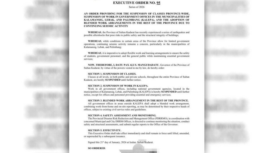 Sa Executive Order, ipinag-utos ni Governor Datu Pax Ali Mangudadatu ang suspensyon ng klase sa lahat ng antas sa pampubliko at pribadong paaralan sa buong lalawigan, “until further notice.”