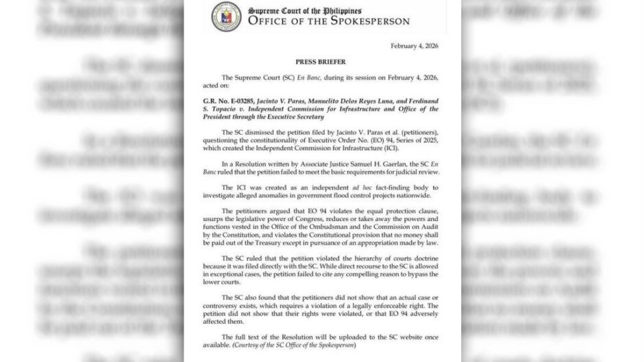 IBINASURA ng Korte Suprema ang petisyon na kumukwestyon sa legalidad ng Executive Order Number 94 na lumikha sa Independent Commission for Infrastructure o ICI.