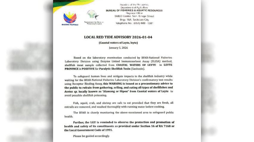 Samantala, patuloy na nasa ilalim ng red tide warning ang coastal waters ng Leyte, Leyte matapos ding magpositibo sa paralytic shellfish toxin ang shellfish meat samples na nakuha sa lugar.