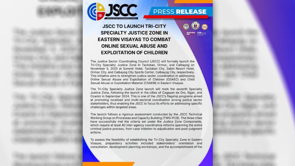 PORMAL na ilulunsad ng Justice Sector Coordinating Council (JSCC) ang Tri-City Specialty Justice Zone sa Tacloban, Ormoc, at Calbayog sa Nov. 5, 2025.